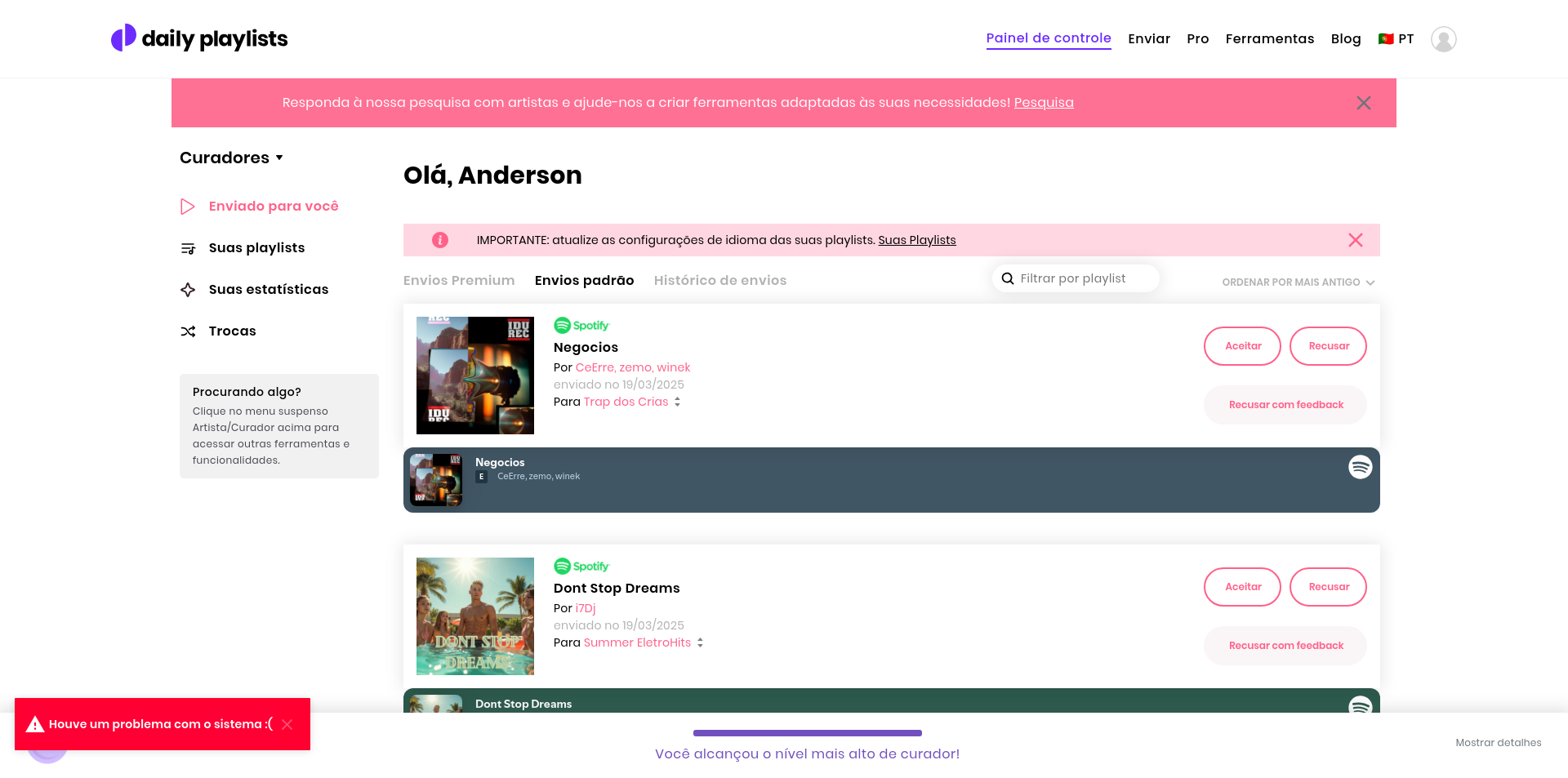 This is appareance as a “Houve problema com Sistema”. Besides, have problem in relation to accept or decline about “Envio Premium”.