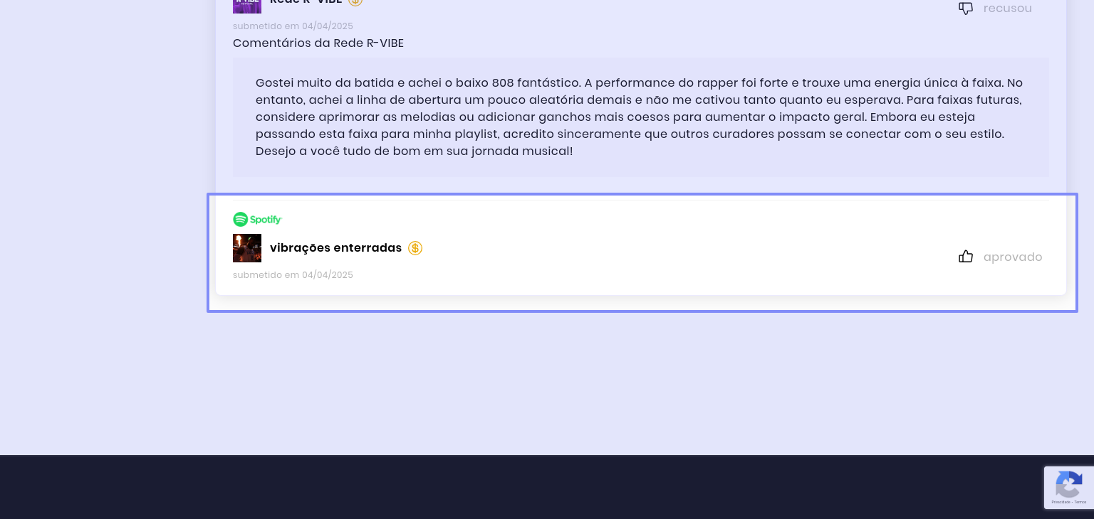 Submeti minha faixa no modo premium e conforme evidenciado abaixo, fui aprovada pela Playlist em questão no entanto não fui colocado na Playlist conforme o que era me prometido em caso de aprovação. Além disso, não há canais que permitam eu acessar ou entrar em contato com o autor da Playlist.