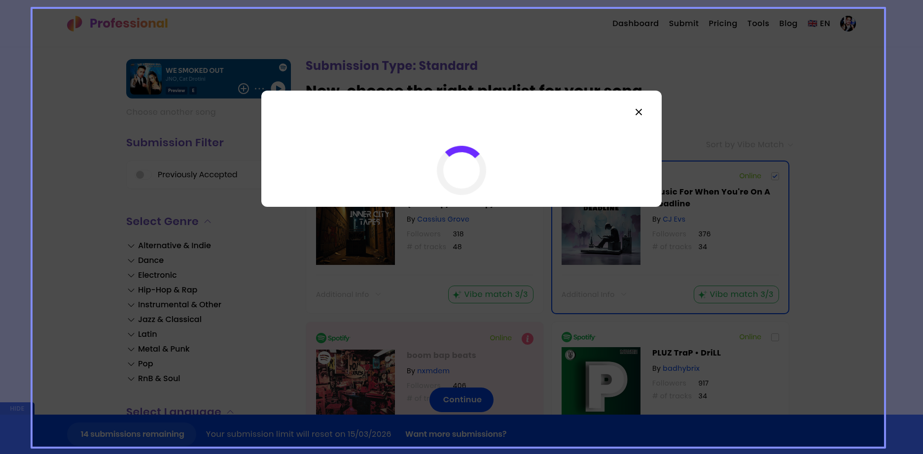 Hi so I recently just signed up for the professional plan and I wanted to use the new submission credits that I get with the membership to promote, however since last night and this morning I've been trying to promote one of my songs to a few vibe matched playlists and there seems to be an error where it won't go through no matter how hard I try or restart the browser I thought it would have fixed itself in a day but please I need this fix because I'm paying for this membership and if I can't use it then I want a refund