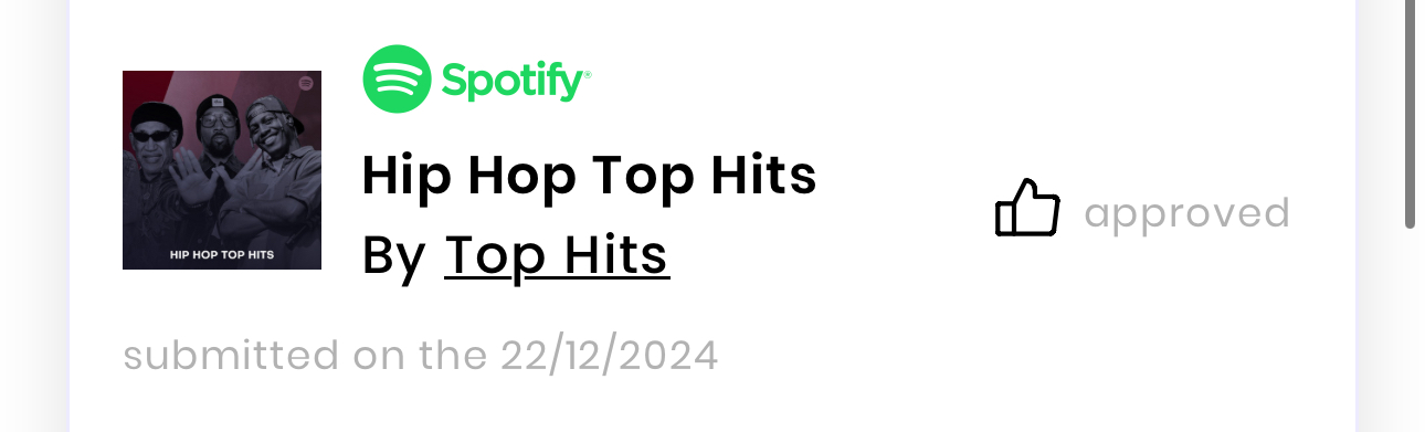 There is an account called “Top Hits” that will accept the song, get the playlist save and immediately delete your song. My song “ON MY MIND” was accepted but was immediate deleted from the playlist