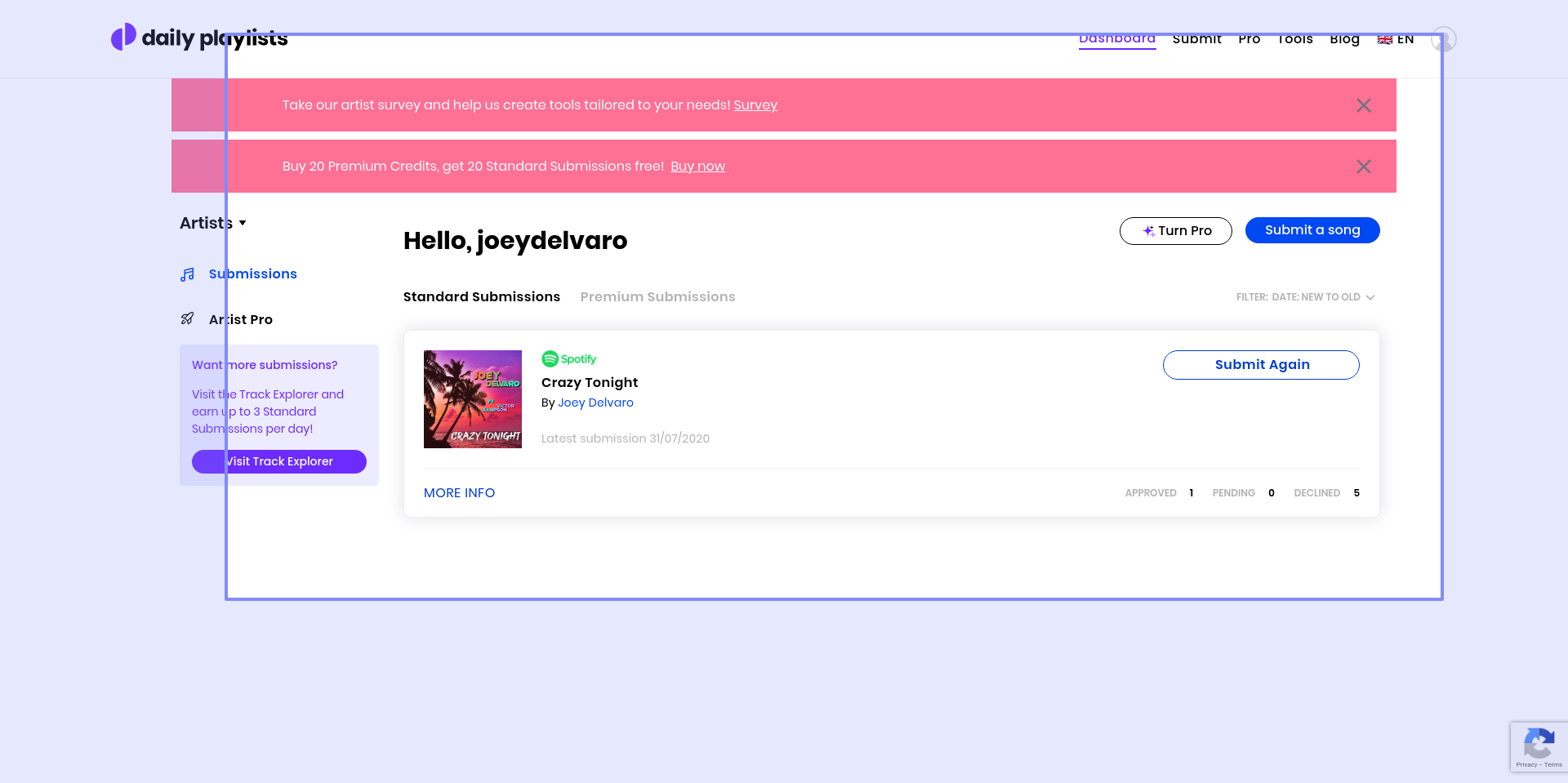 Yesterday i submitted my playlist ‘‘2025 | Summer Dance’’ to your website and it got registered. But where and how can i find new submissions for my playlist from other artists who want some feedback or a place in my playlist? Can you help me out with this?