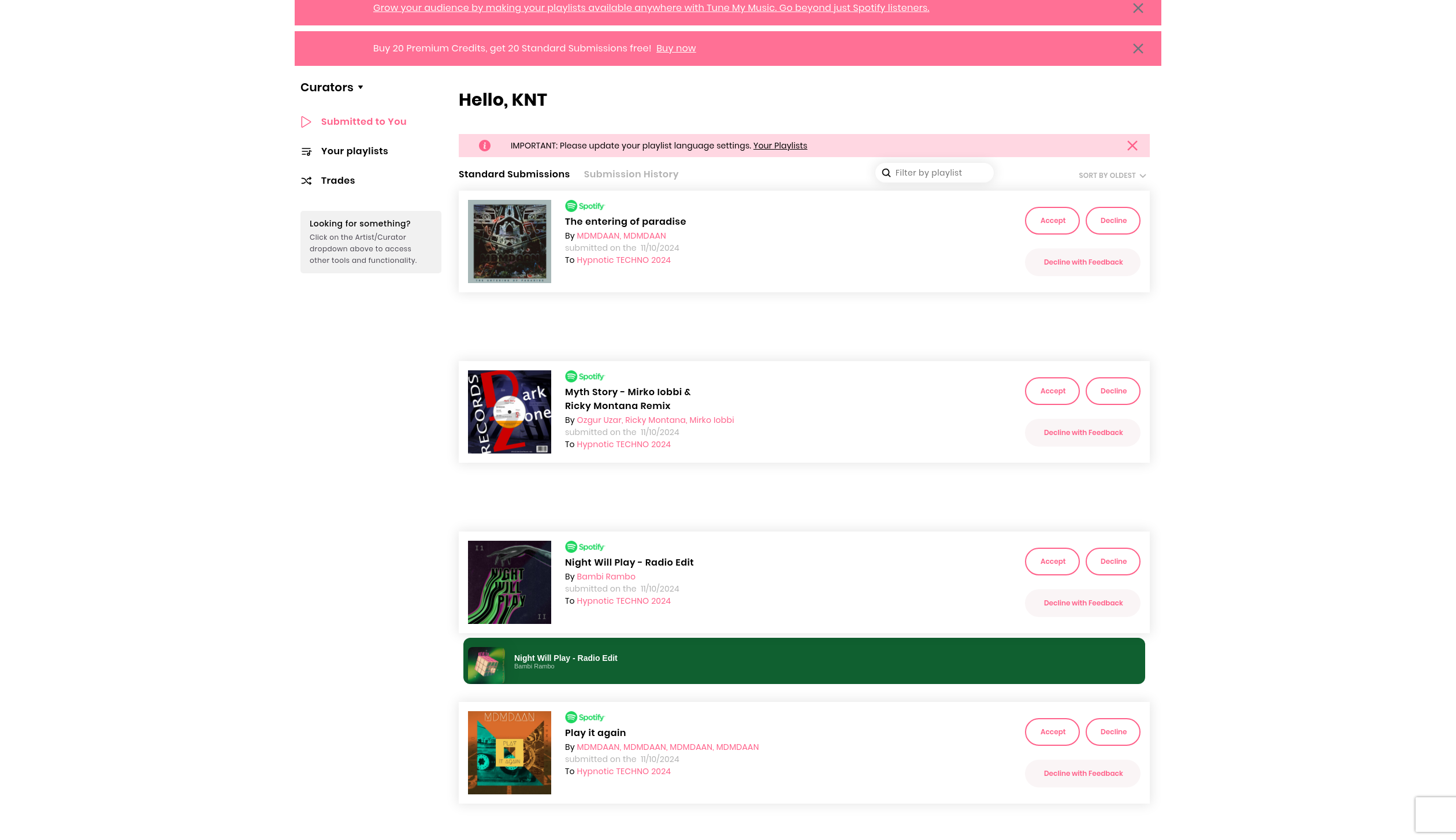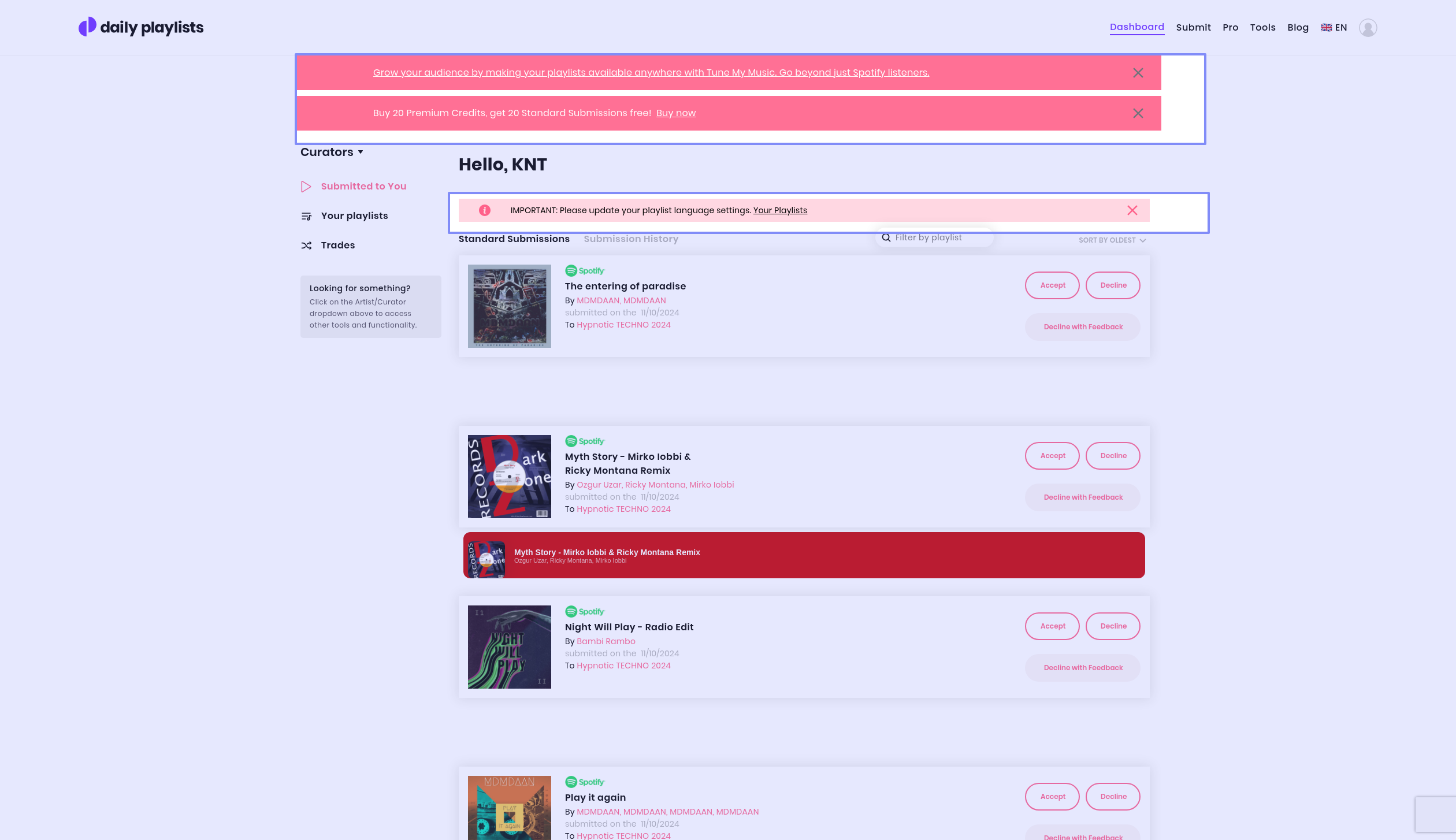 I already changed the language to “instrumental” multiple times, but the Dashboard again and again shows to me the “IMPORTANT: Please update your playlist language settings.” message. Also, same happens with the messages “Grow your audience…” and “Buy 20 premium credits…”, I closed that multiple times but they continue appearing