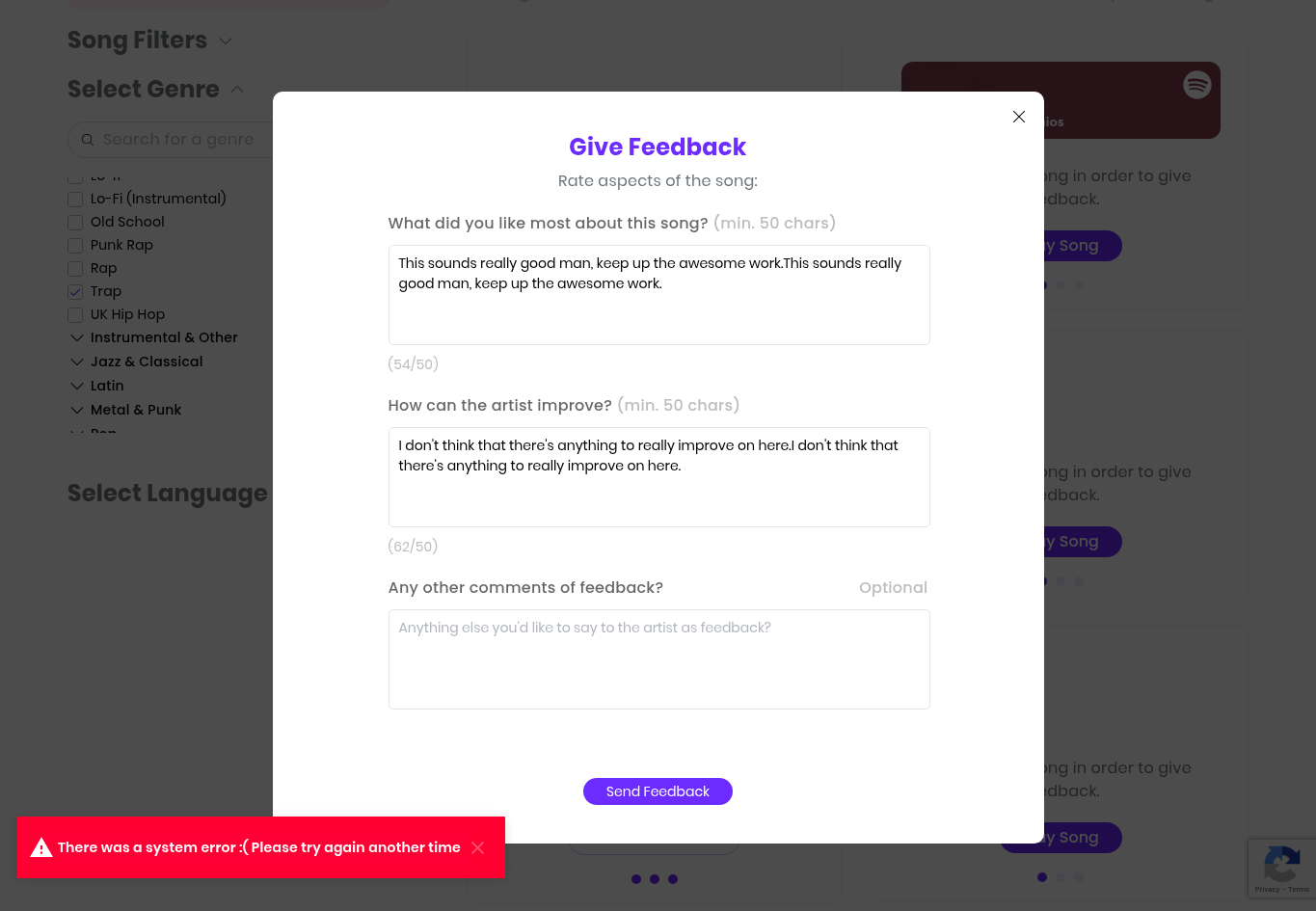 I keep getting this everytime I try to submit feedback on a song it keeps saying, “there was a system error :( try again another time.” or something like that. Hopefully I can get some help.