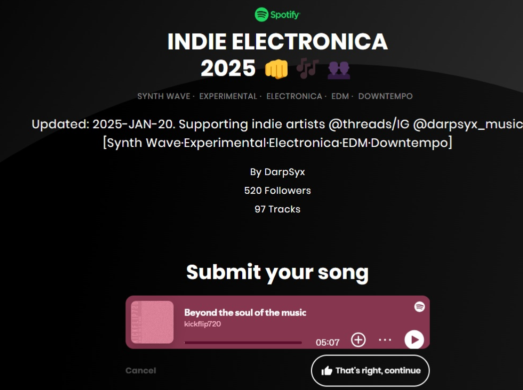 I’ve been having reports of users trying to submit a track to my playlist on this page, and they can’t click on the continue button